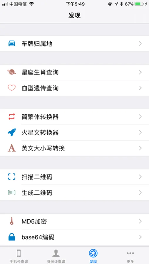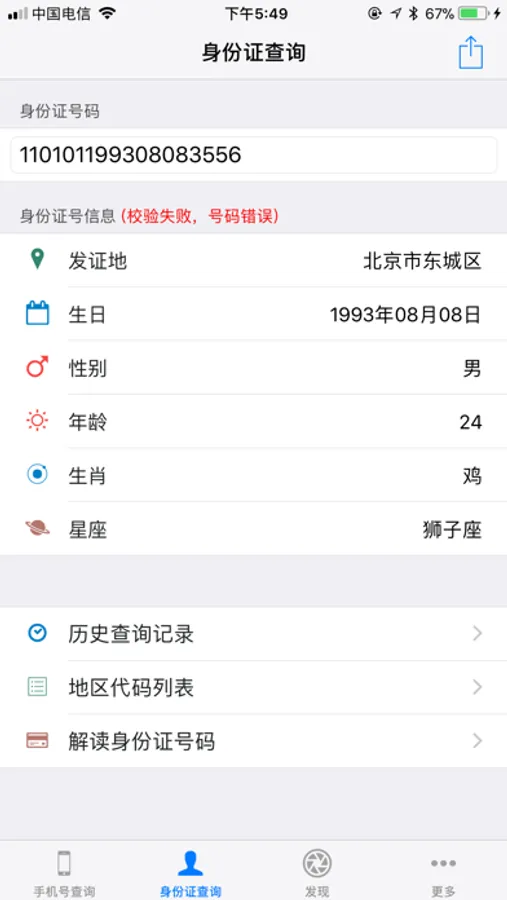 - 身份证号查询,包括发证地、生日、性别、年龄、生肖、星座等信息,号码校验是否正确。