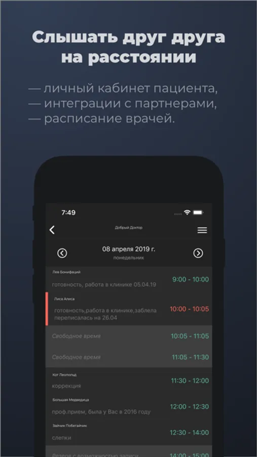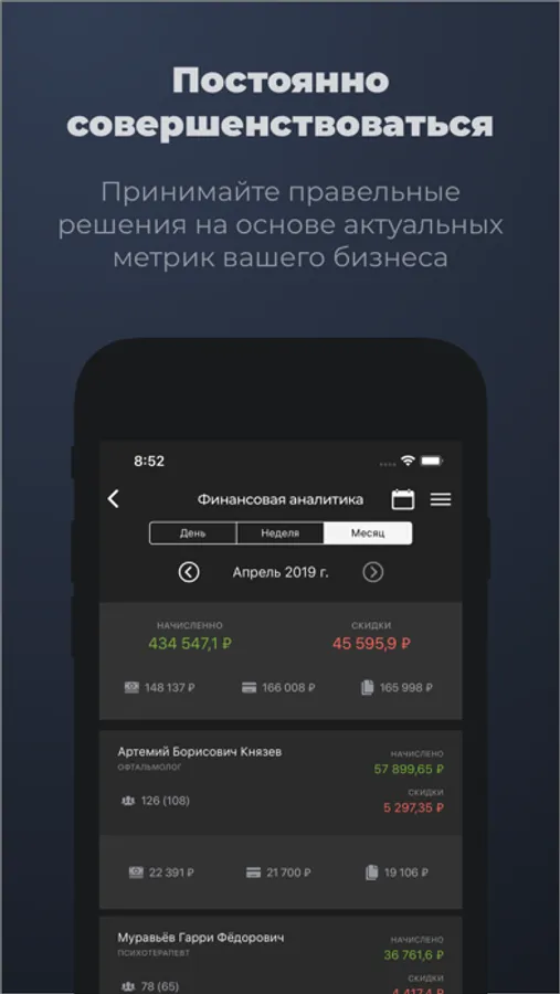 Мобильное приложение Cloud-Clinic предоставляет возможности по удобной организации личного кабинета руководителя на мобильном устройстве. С помощью него вы всегда сможете узнать текущий баланс, посмотреть финансовый отчет, детально изучить кассовые операции и уточнить расписание врачей. Так же, при помощи данного приложения врачи клиники всегда будут знать актуальное расписание приемов.