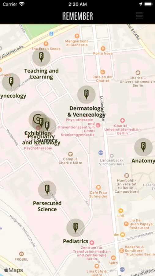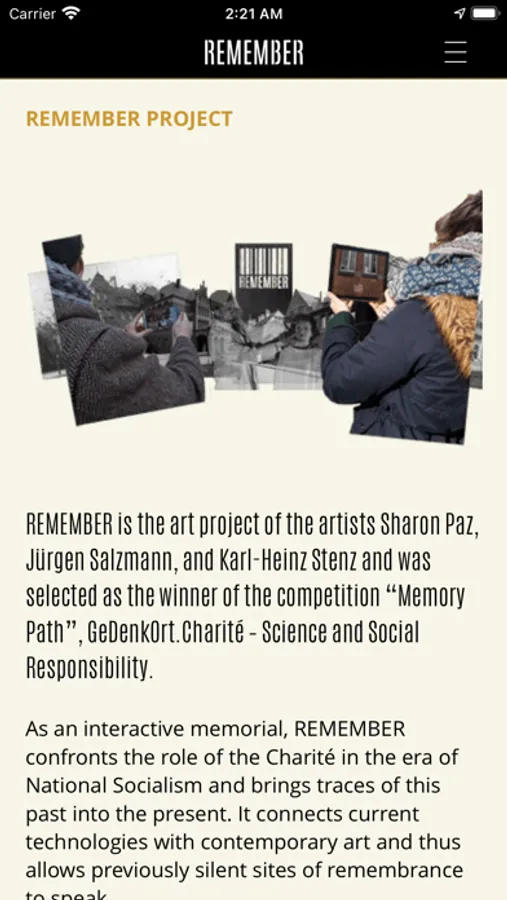 Experience in a special way different aspects of the history of the Berlin Charité during the era of National Socialism. The REMEMBER app accompanies you on your journey through the Campus Charité Mitte in Berlin. The app leads you to six memorial sculptures and opens up artistic perspectives on this dark episode of history. As an interactive memorial, REMEMBER brings traces of this past into the present. It connects current technologies with contemporary art and thus allows previously silent sites of remembrance to speak.