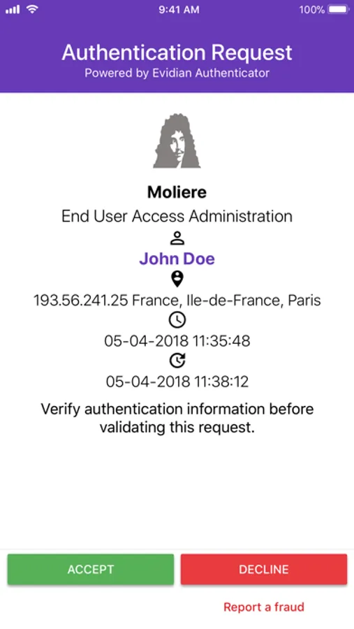 When used with Evidian Web Access Manager, any modification of the user’s profile in WAM will generate a confirmation notification in Evidian Authenticator (GDPR). All account or key usages are tracked and kept in the history of Evidian Authenticator.