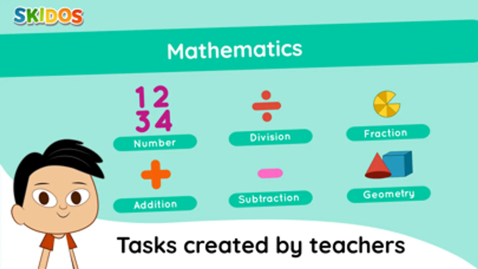 MATH: Our math exercises cover a comprehensive list of topics including number sense, addition, subtraction, multiplication, division, geometry, etc. Tasks evolve as a child progresses. Interactive design and animation support learning - three cute little SKIDOS mascots help and encourage kids when they work on the assignments.