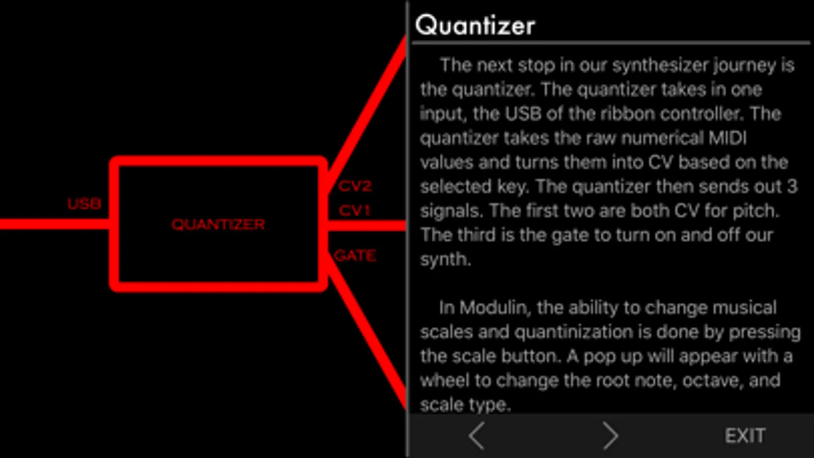 New to synthesis? No problem. Modulin has an explore section that takes you through every component in an analog synthesizer, describing what it does alongside a diagram of how signals flow through it.