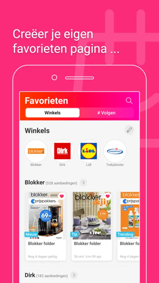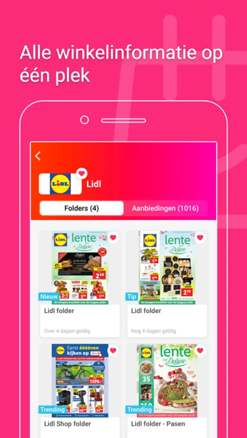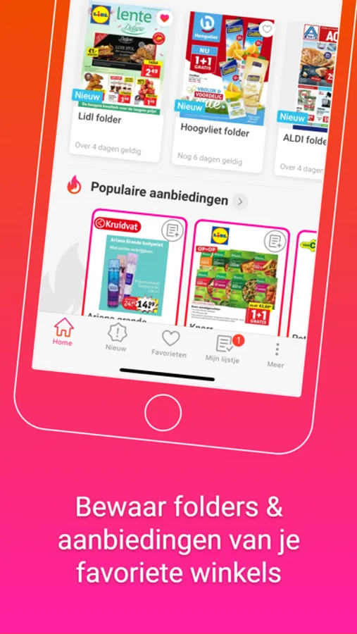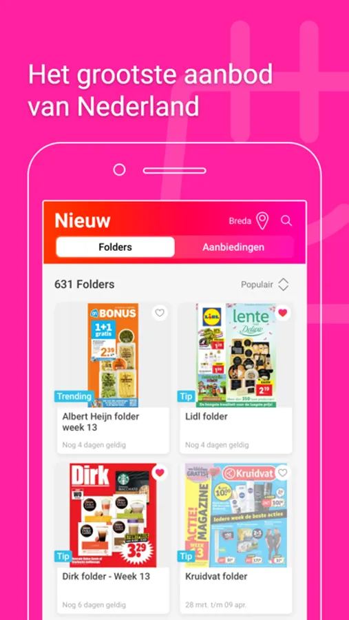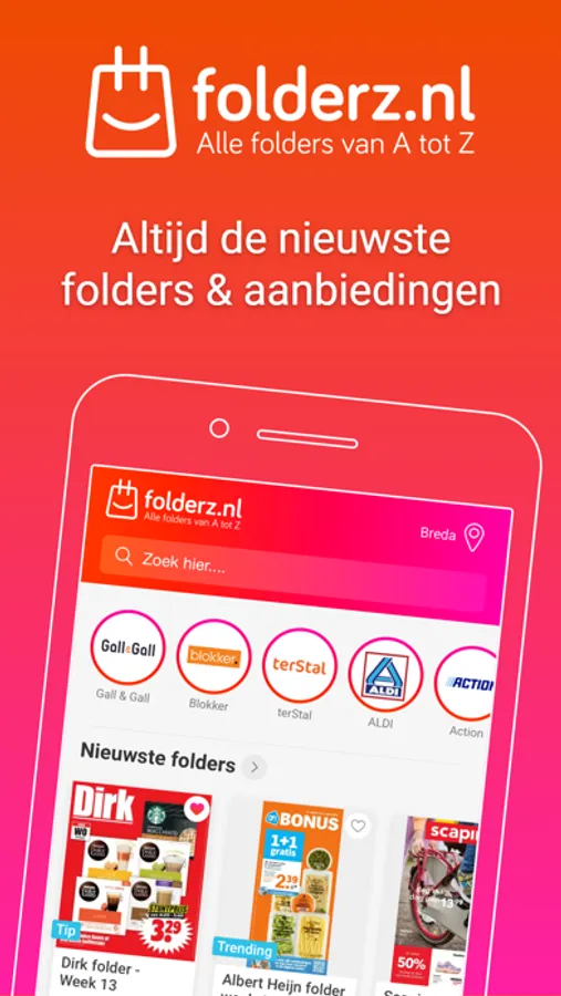 Onze app: Folderz.nl : alle aanbiedingen (uit folders en reclamefolders)l toont je alle actuele folders van grote en kleine winkelketens in Nederland, niet alleen alle supermarkten en bouwmarkten, maar ook elektronicazaken, modezaken, speelgoedwinkels, computerwinkels, drogisterijen en nog veel meer. Zelfs de meeste lokale winkels hebben we voor jou vermeld. Wil je een winkel als favoriet selecteren, dan kan dit eenvoudig door op het hartje te klikken. Hiermee ben je altijd als eerste op de hoogte van aanbiedingen van jouw favoriete winkels en heb je jouw favoriete reclamefolders handig bij elkaar verzameld.