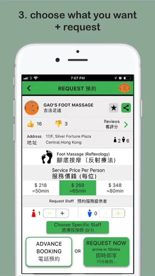 The Gao's massage app allows you to request services in the realtime "NOW", you can request a Foot massage, Oil body massage, Pressure point body massage or other services at an instant.