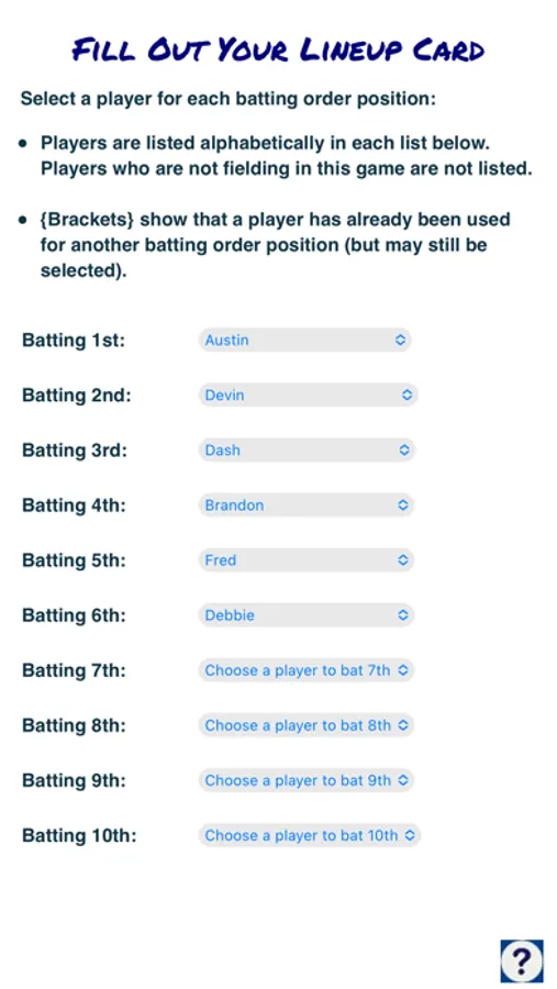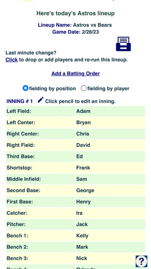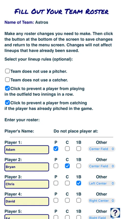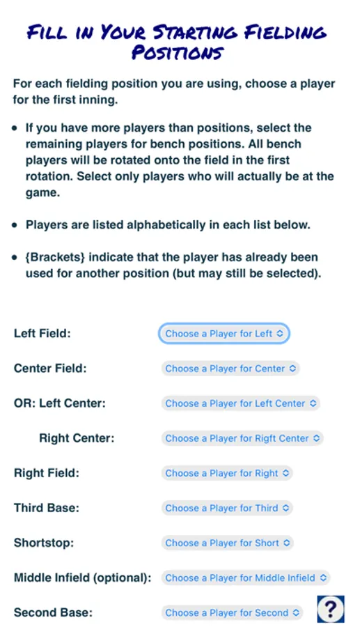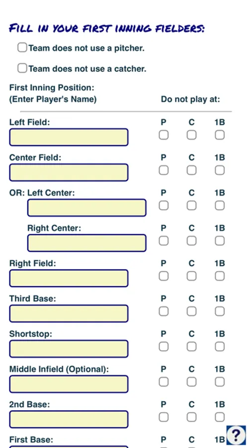 You can build lineups for up to 11 fielding positions, or for coach-pitch or coach-catch. Plus up to 6 bench positions, which rotate in after the first inning. And you can lock out individual players from playing first base, catcher, or pitcher, for safety. Give it a try!