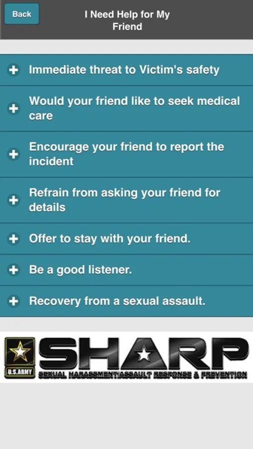 In addition, it provides information on possible ways to respond to sexual harassment and sexual assault. You can access information within the app to learn more about sexual assault response, such as what to do if you or someone you know has been assaulted.