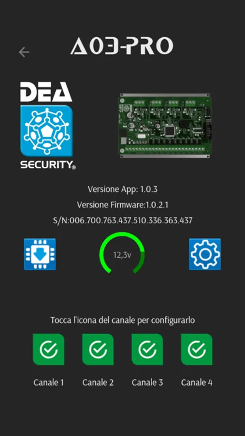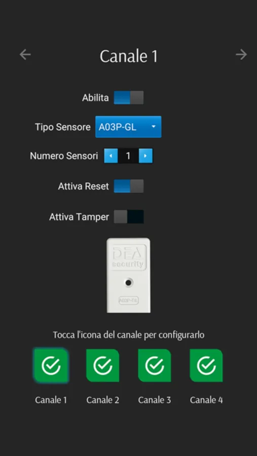 A03 PRO App allows you to configure and calibrate the A03 PRO system using your smartphone. Thanks to the DEA WiFi dongles (DG-DEA-WF and DG-DEA-WF2), the A03 PRO App is able to connect to the BR-A03P-Z4 analysis board, which manages 4 channels of two sensors each, for protection of windows (SN-A03P-DR and SN-A03P-DRM), glass (SN-A03P-GL), walls (SN-A03P-WL) and metal gratings (SN-A03P-GR).