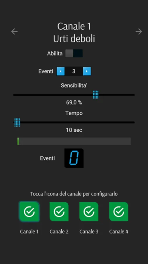 - real-time display, with dedicated graphic icons of the status of the individual channels (pre-alarm, Low Attacks alarm, Heavy Attacks alarm, continuous Impacts alarm, opening and tampering)