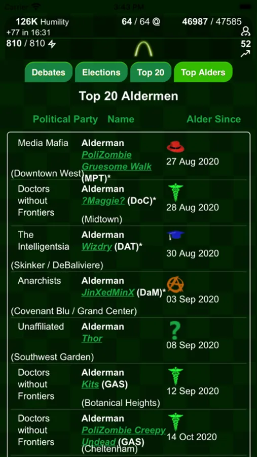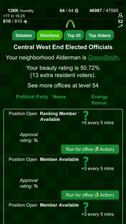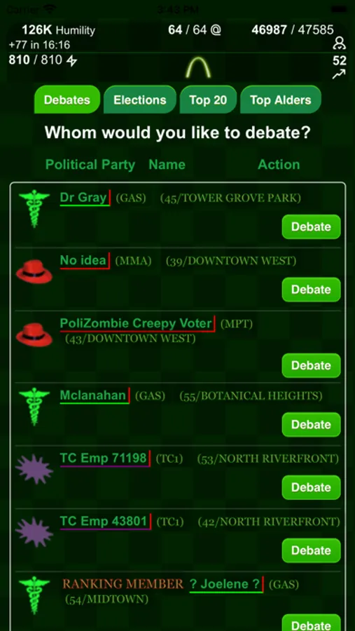 * Named clans, political parties, and elections help you advance your player and your clan