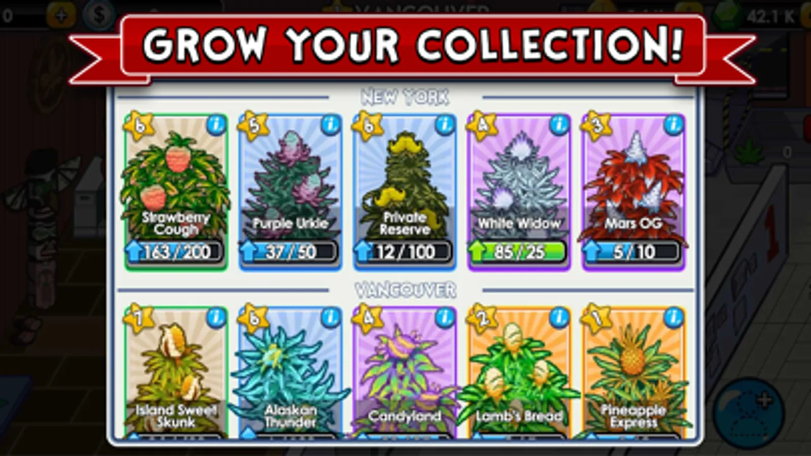 ● Build and upgrade your strain collection with dozens of your favorite Indica, Sativa, and Hybrid weed strains.