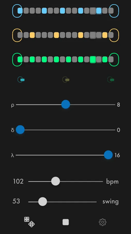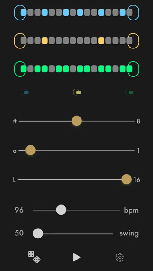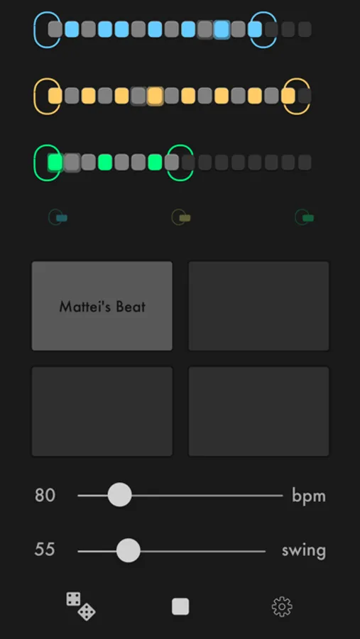Create combinations of beats for three percussion instruments. Adjust their tempo and swing.