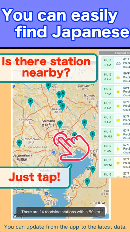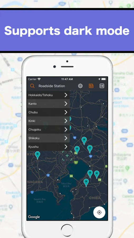 By tapping the center mark on the map, you can also set pin a road side station within 50 km.
