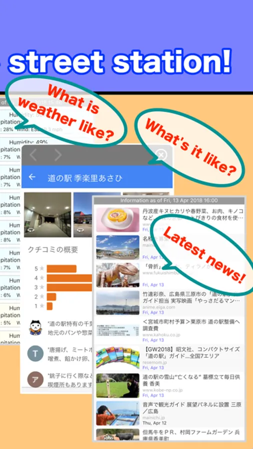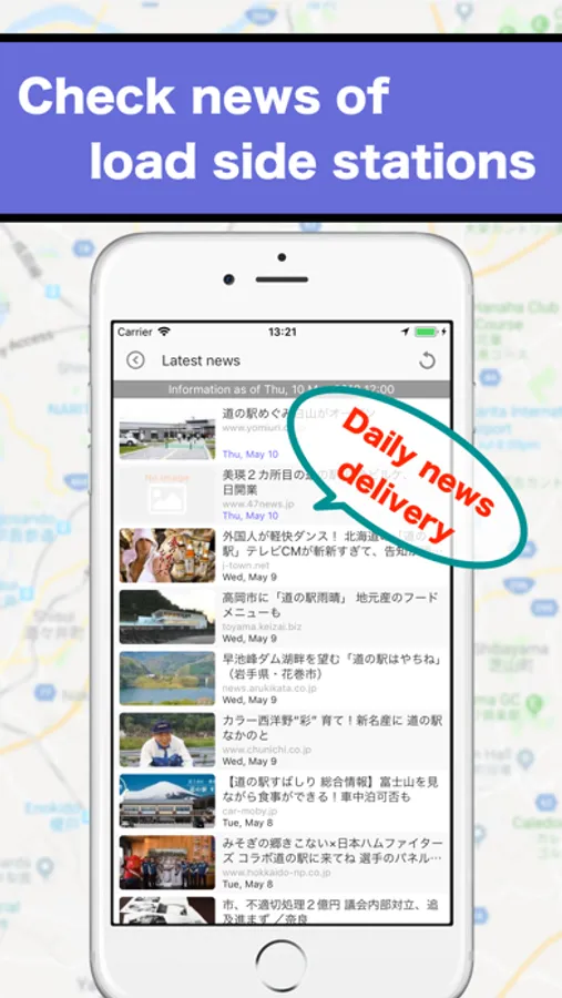 You can check the latest news about road side station every day. When there is newest news, the news-icon turns red on the main screen. You'll not miss the information on such as events and more etc.