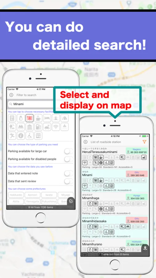 The app has two types of search a way, one from the map and the other by specifying detailed conditions from the list.
