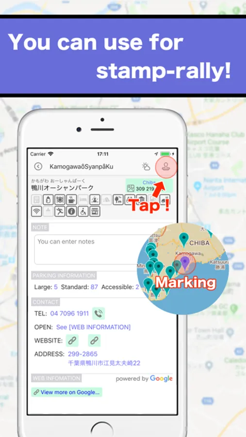 If you are challenging the stamp-rally of the road station, you can record by just tapping at detailed screen, and identify the place that you visited on the map.