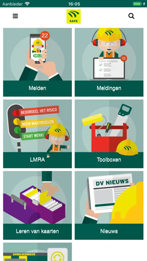 De gebruikers van de SAVE app hebben toegang tot het melden van gevaarlijke situaties, bijna-ongevallen, veilige situaties, ongevallen en meldingen van agressie en geweld. In SAVE kun je veel informatie terugvinden. Bijvoorbeeld over de voortgang van je melding, maar ook Toolboxen, Leren van Kaarten en Nieuws.