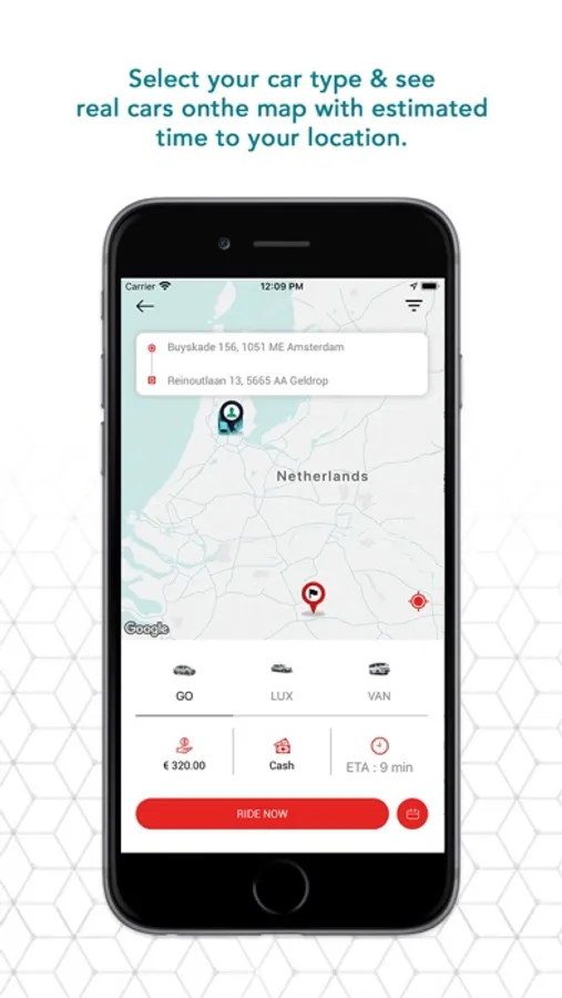Select your pickup location on the app to request a taxi. You can customize your order by selecting a drop-off location, a number of vehicles, type of vehicle and payment method. When your order matches with a nearby taxi, it will give you an estimated time of arrival. It’s that easy!