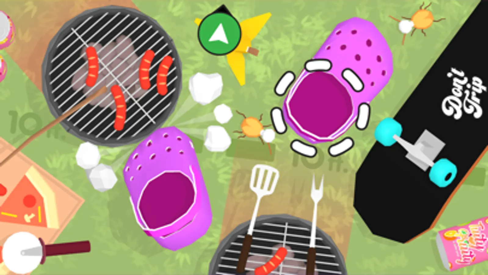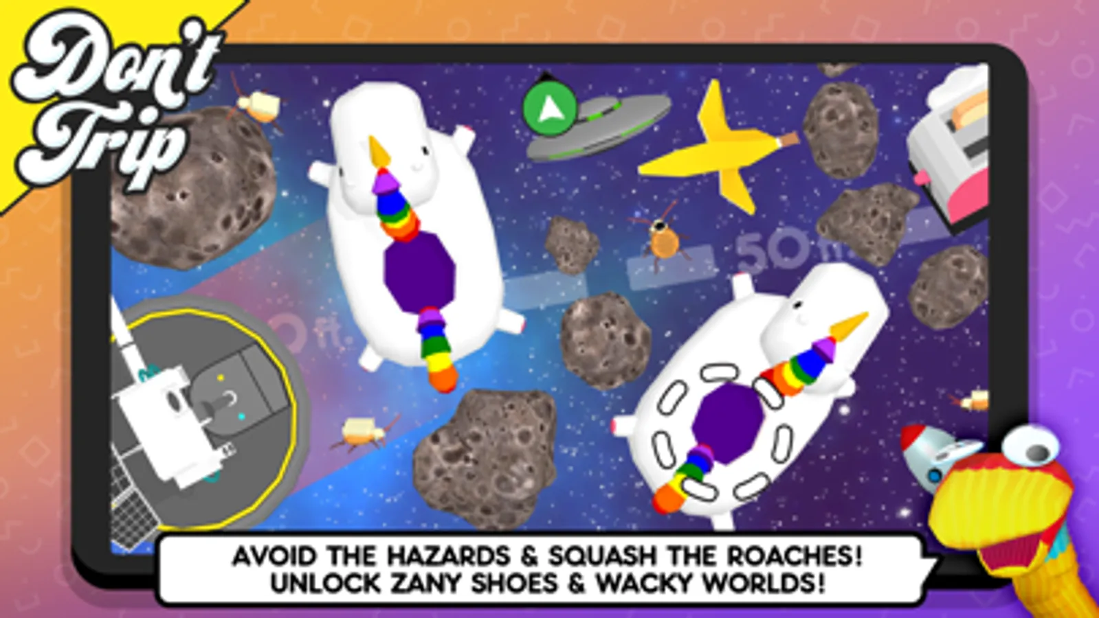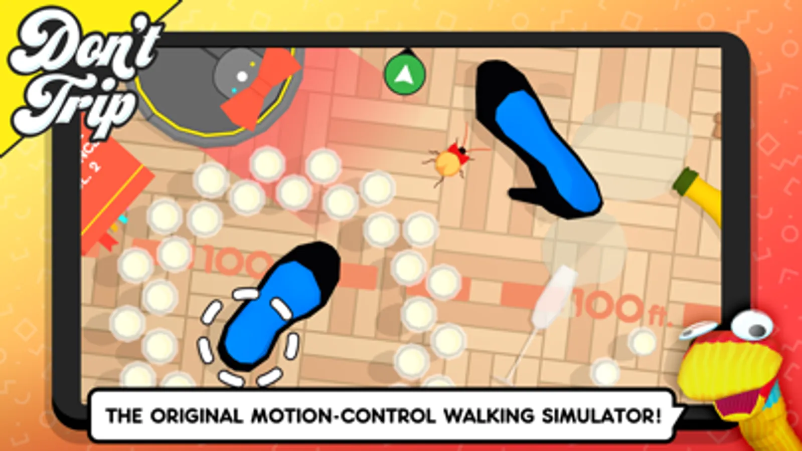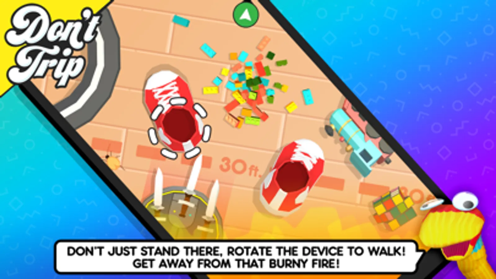 Avoid obstacles in this silly walking simulator! Shoes appear under your fingers and you must spin the phone to reveal the world. With the most unique controls you've ever seen, you’ll be fleeing from fire, stomping on cockroaches, and running from robot vacuums, all while trying to avoid toys, plastic bricks and garbage! Have you got what it takes?