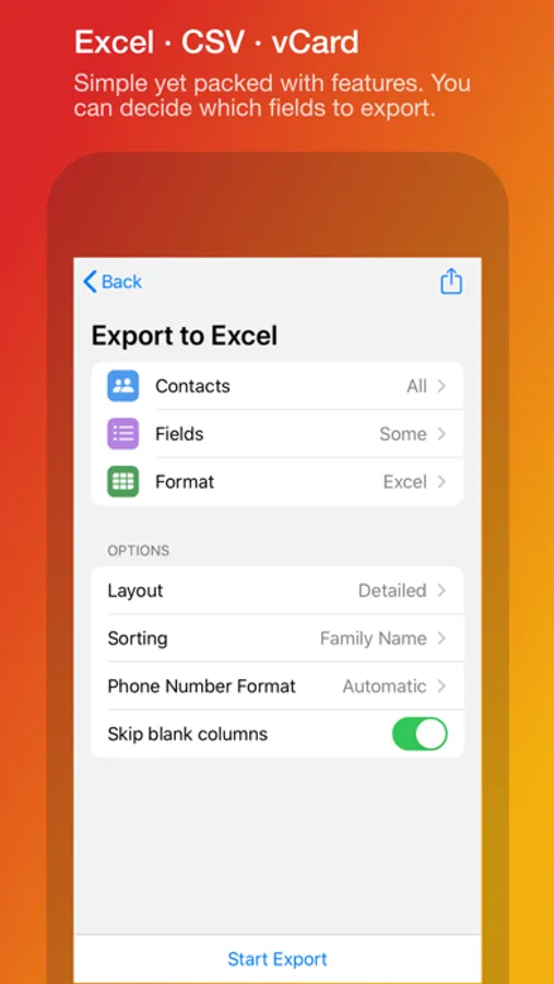 Export your contacts to Excel & CSV or make quick backups to a vCard file. You can decide which fields to export. Works with thousands of contacts, even on older devices.