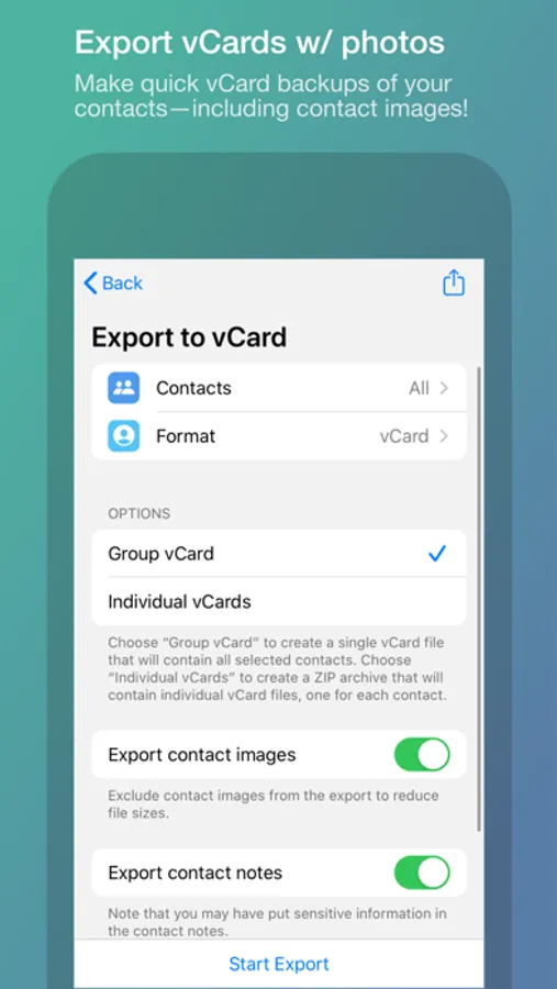 - In contrast to similar apps, contact pictures and notes do not get lost when exporting to vCards.