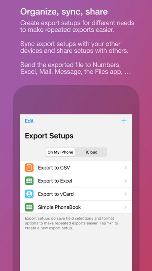 - An export setup remembers all settings such as target format and field selection. Once created, only one tap is needed to start the export, which makes repeated exports child's play.