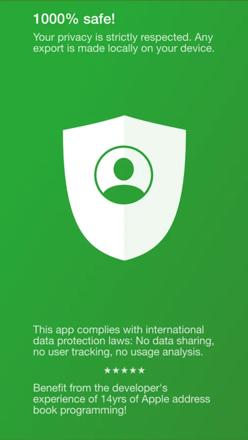 Export Contacts Pro respects your privacy and complies to international privacy laws. Any export is done entirely locally on your device. In contrast to other apps, Export Contacts Pro does not analyse your contacts and it does not force you to login into some online service in order to do its job. The app also completely dispenses with usage analysis and any user tracking.