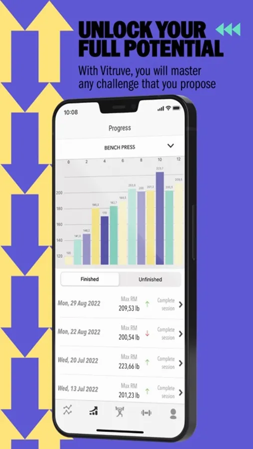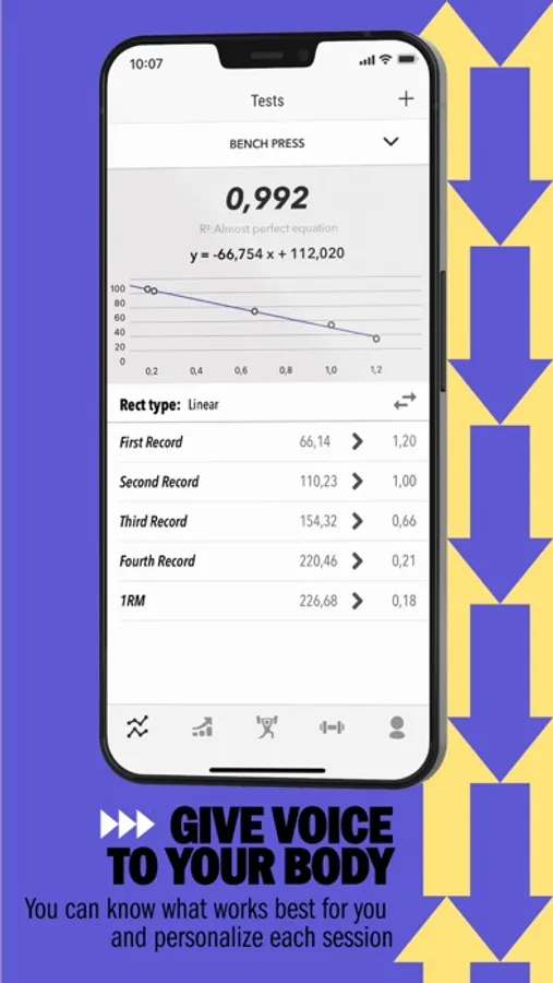 Every day, your 1RM is different. There are a lot of variables that may affect it, and your performance may also vary up to 20% each day! The Vitruve app calculates instantly your daily 1RM without having to lift it or reaching muscle failure.