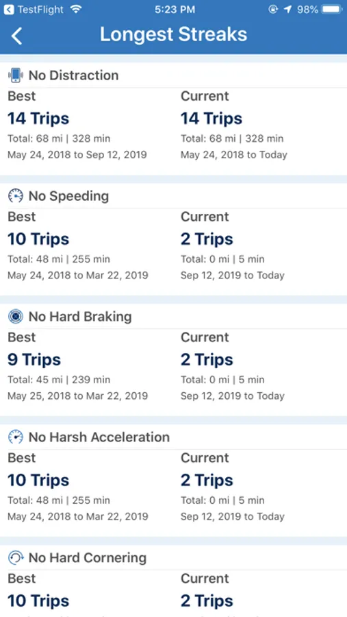 Rewards are of course great, but there are other fun features too! Leaderboards allow you to see how you’re doing compared to your peers, trends let you see how you do over time, streaks let you see how many consecutive trips you’ve gone without a negative event, and badges track achievements over time – number of miles without a speeding incident, etc.