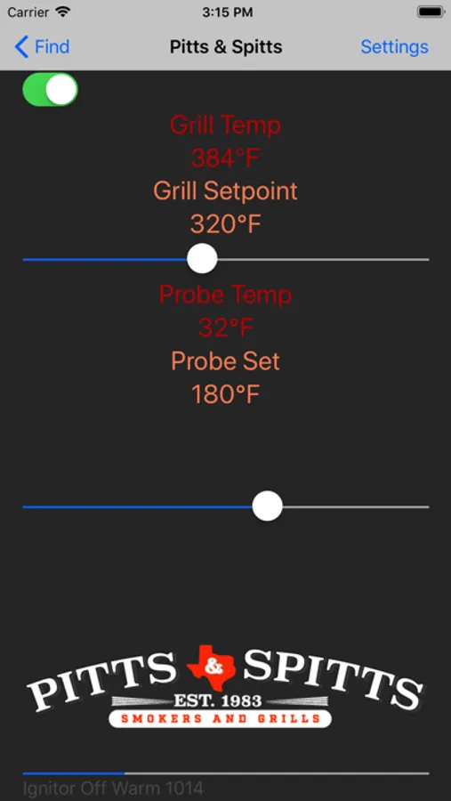 The Pitts & Spitts application lets you connect your pellet grill to your phone using WiFi. The system requires a custom WiFi adapter wired to the grill. Once the pellet grill is found, you can adjust the set point temperatures for burn chamber and the meat probe. This will allow you to monitor the current temperatures of both.