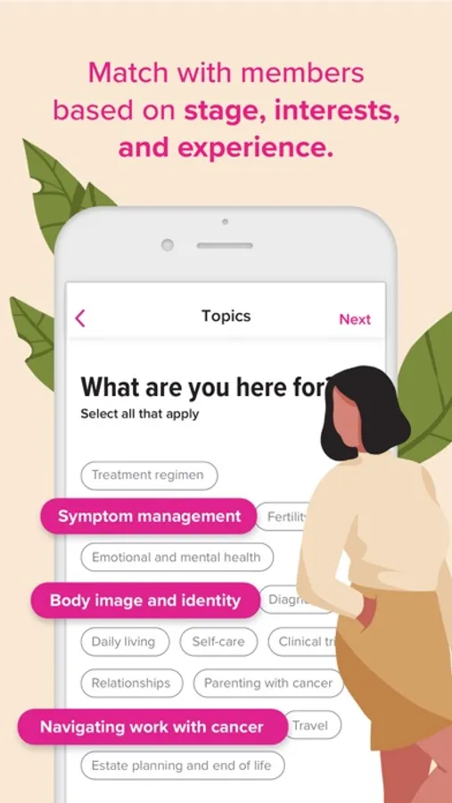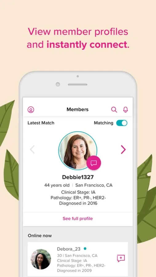 Let us connect you with a new member from our community every day. We’ll recommend members to you based on your treatment plan, lifestyle interests, and needs. Browse member profiles and request to connect with anyone from our community with members listed as “Online now.”