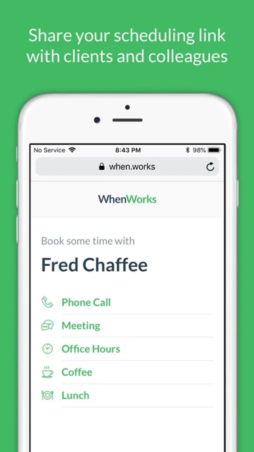 WhenWorks eliminates the hassle of scheduling meetings by allowing clients and colleagues to automatically book time with you online, only when you're free and only during the time slots you've defined.