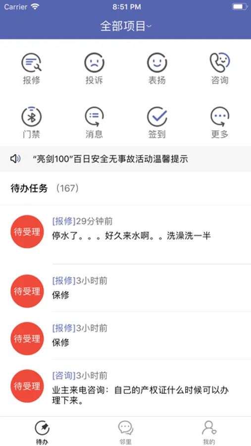 6.即时消息提醒:报修处理情况、活动通知首页提醒;