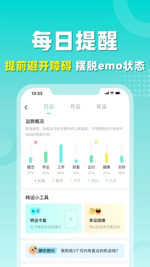 2、测感情、测财富、测婚姻、测学业、及众多心理测试,让你玩得尽兴。更有幸运之城、爱情鉴定、好友合盘等诸多有趣功能,助你了解宇宙,探索人生,享受快乐。