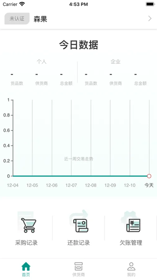 “采购助手”为森果为果蔬行业采购人员提供的效率工具。可以查看采购记录、采购还款欠款数据等。