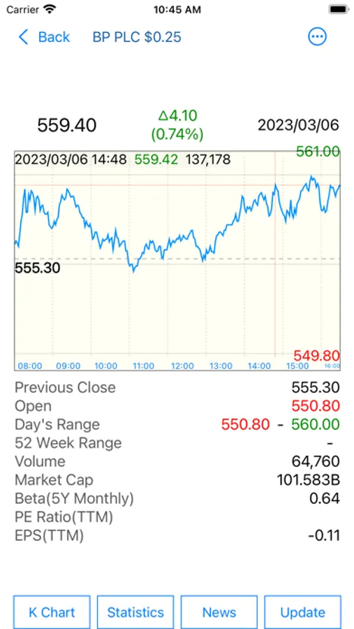 - Show the detailed stock information: open price, last price, change, change percent, volume, day low, day high, week 52 high, week 52 low, EPS(TTM), PE Ration(TTM), Beta, Market Cap, etc.
