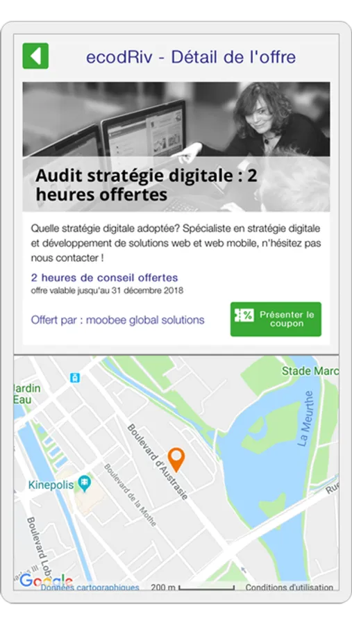 Soyez informés de toutes les offres promotionnelles, les bons plans, les promos flash... qui vous entourent. Des offres privilégiées conçues et proposées par tous les commerçants, artisans, entreprises membres de Rives De Meurthe.