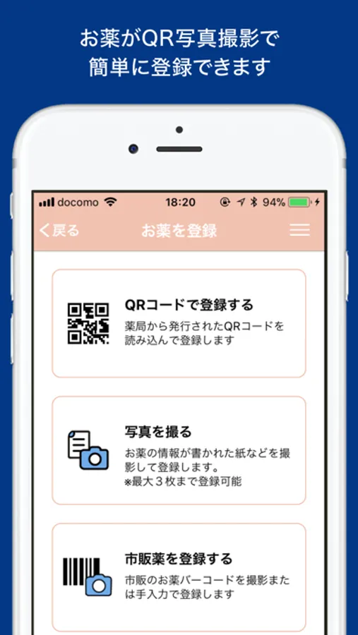 -QRコードで登録:薬局で発行しているQRコードを読み込んでお薬を簡単に記録できます。