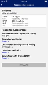 Myeloma Response is an educational medical calculator to illustrate the response assessment to Multiple Myeloma treatment. Multiple myeloma (MM) is characterised by the neoplastic proliferation of plasma cells producing a monoclonal immunoglobulin. This clone proliferates in the bone marrow and can lead to skeletal destruction as well as damage to various organs (e.g. renal failure). The International Myeloma Working Group (IMWG) has developed consensus response criteria, which are used to measure the effect of treatment. These criteria are very complex and this educational medical calculator demonstrates the interdependency of the different variables. Uniform assessment of response categories is important to guide clinical care and to ensure consistent reporting of clinical trials.