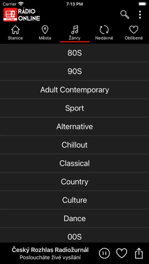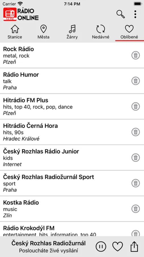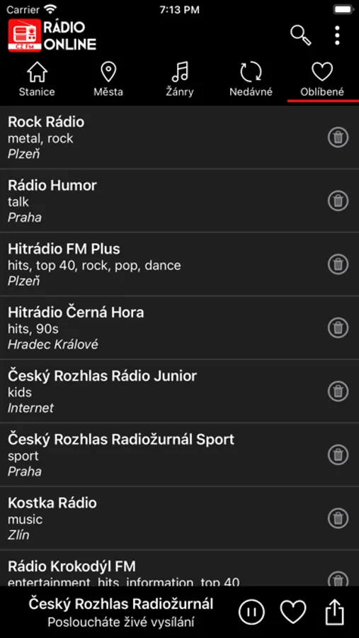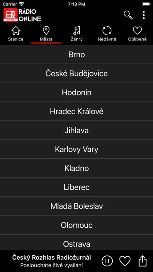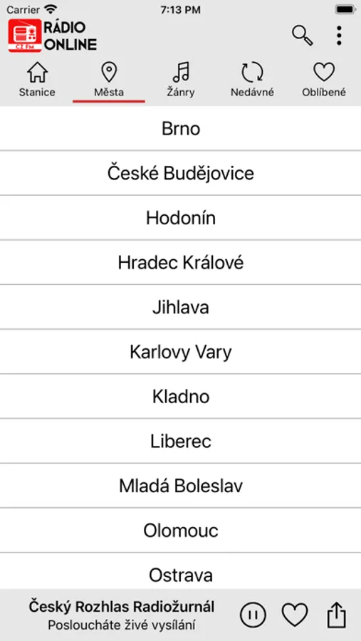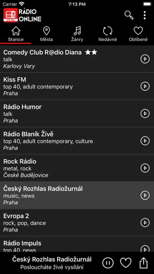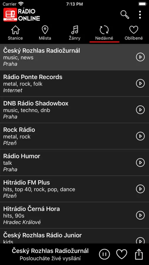 Možnost "Nedávné" zobrazuje posledních 50 poslouchaných českých FM rádio stanic, takže se můžete jednoduše vracet k tomu co jste poslouchali dříve.