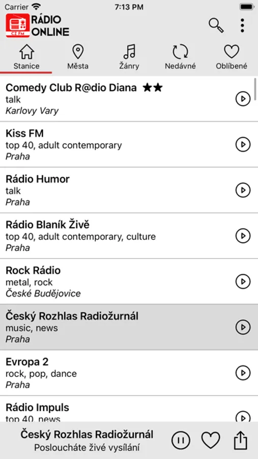 Můžete vyhledávat v seznamu populárních českých rádio stanic v mobilním telefonu pomocí kritérií, jako jsou žánry nebo města. Seznam českých rozhlasových stanic je tříděn podle oblíbenosti stanice v rámci aplikace. Po výběru vaší oblíbené rozhlasové stanice a stisknutí přehrávání zůstane aplikace nadále v pozadí, tudíž můžete nadále používat veškeré funkce telefonu.