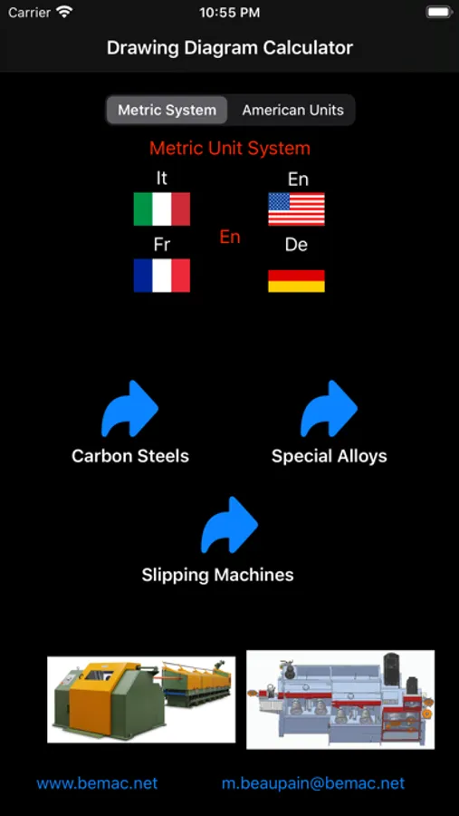 The program calculates the drawing diagram of Carbon and Stainless Steel wires, Bronze, Aluminium, Zinc and Copper wires. For Aluminium and Bronze, we considered the analysis more popular and with the higher tensile strength. For Zinc we considered the material with 99% of base material. Matra is working in English, Italian, French and German languages.