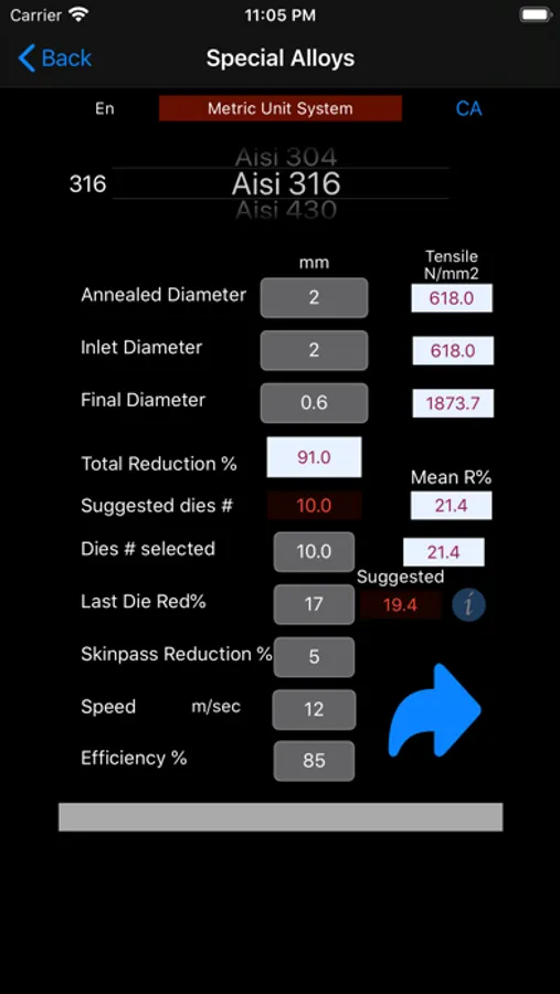 It is possible to work with constant or with decreasing reductions, to set the reduction of the last block and, in the case of external skinpass, to set the value of it. It suggests also the needing dies number letting you enter your choice in the underneath field.