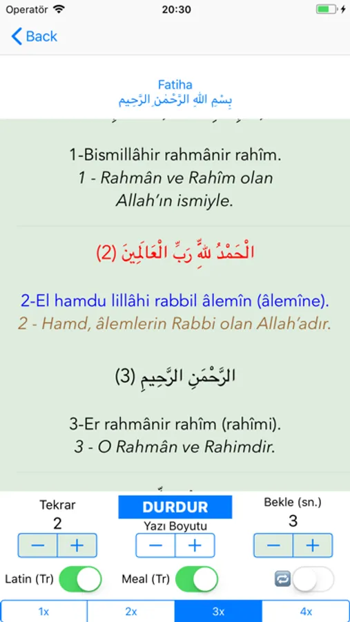 Her bir cümlenin kaç kere tekrar etmesini ve tekrarlar arasında kaç saniye beklemesini istiyorsanız, hemen o ekranda bunları ayarlayabilirsiniz. Sureyi veya duayı dinlemeye başladığınız anda bile tekrar sayısı ve bekleme zamanı ayarlarında değişiklik yapabilirsiniz. Dinlediğiniz ayeti (veya cümleyi) tekrar etmeniz için araya uygun bir bekleme zamanı ayarlamanızı tavsiye ederiz.