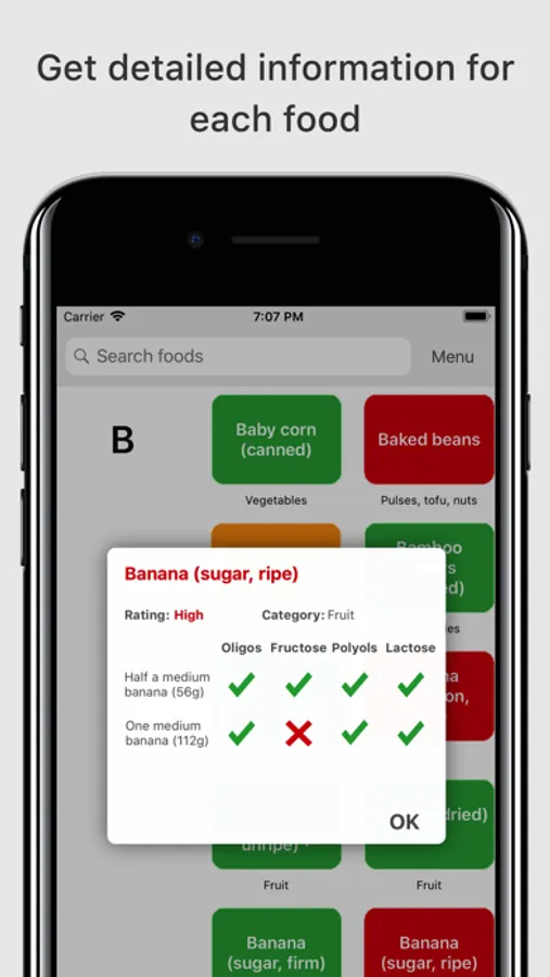 - Breakdown of each FODMAP rating (showing oligos, fructose, polyols and lactose content)