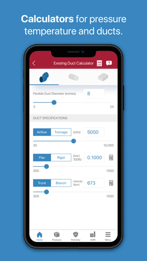 * access multiple useful calculators, including the PT calculator, Sub-Cool calculator, Superheat calculator, Existing Duct calculator, and New Duct calculator