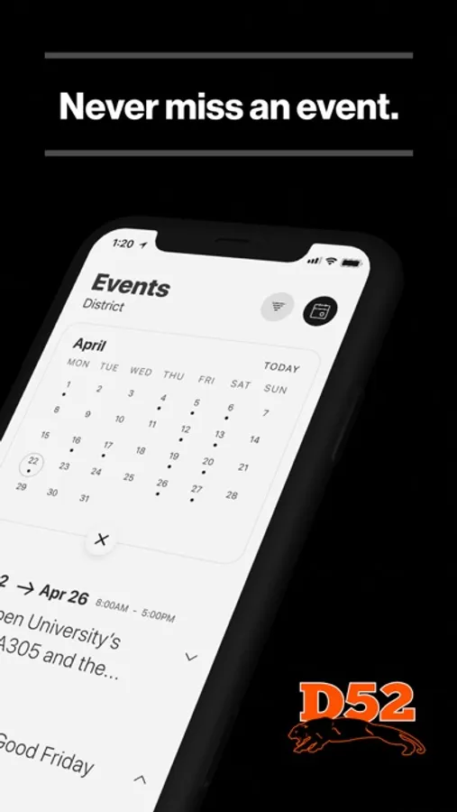 The event section shows a list of events throughout the district. Users can add an event to your calendar to share the event with friends and family with one tap.
