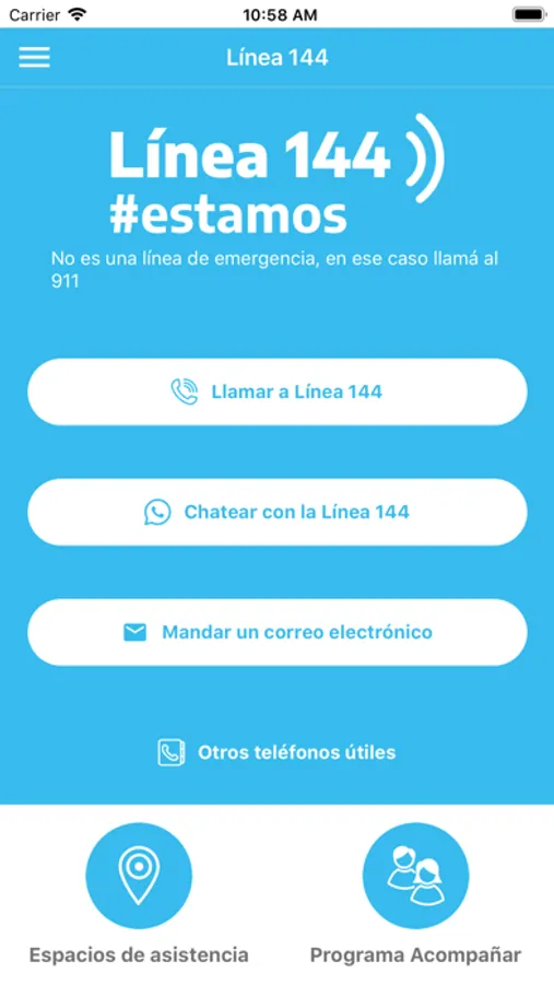 - La aplicación permite que te comuniques con la Línea 144 por teléfono, WhatsApp y correo electrónico.