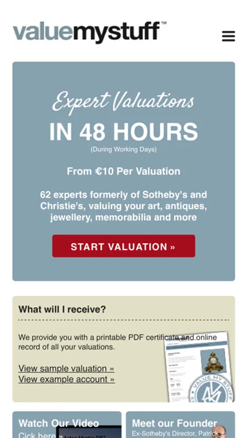 ValueMyStuff offer expert art, antique and collectable valuations and appraisals, spanning more than 60 categories, including contemporary art, jewellery, classic cars, watches, furniture, books, pop memorabilia and much more too. With ex-Sotheby's and ex-Christies valuations experts, we are the world's number 1 online valuations service.