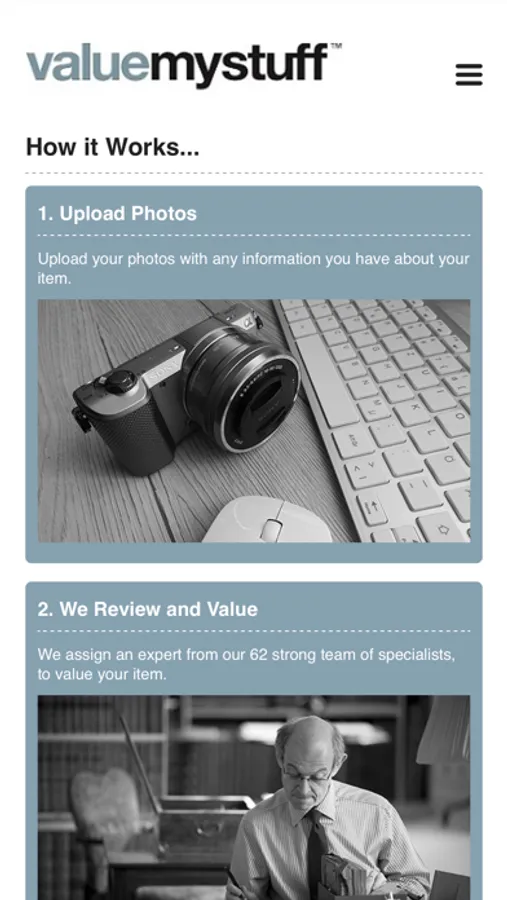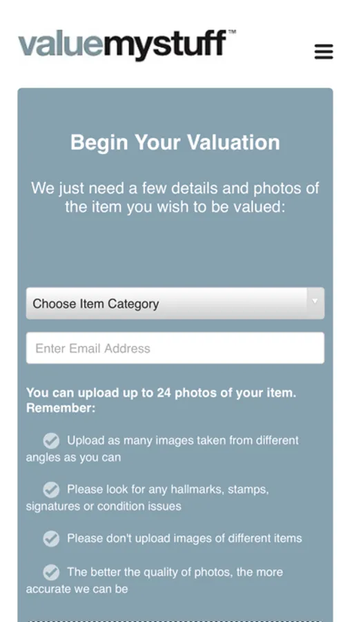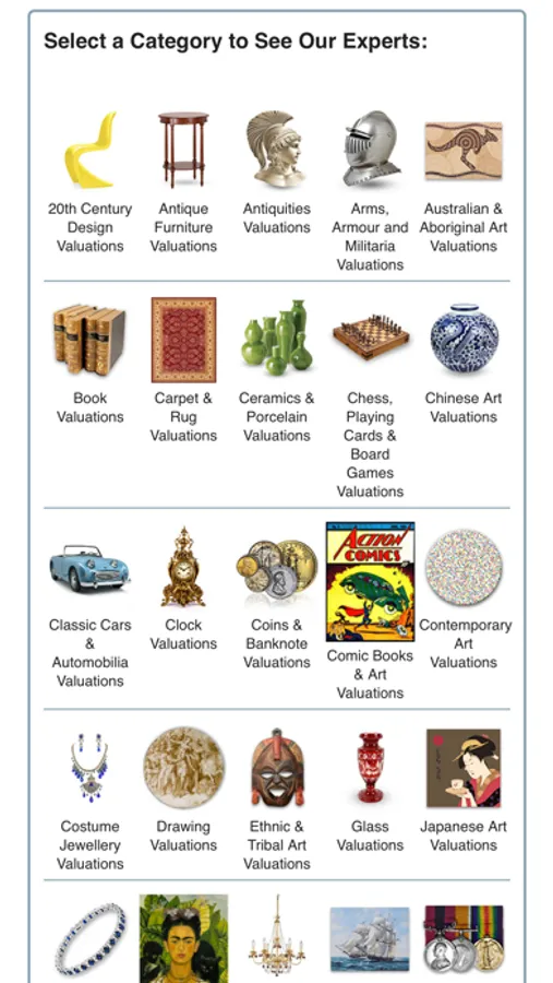 Submit anything for valuation. Yes, anything! Simply take photos of the item, upload them, checkout and our support team will assign the submission to the appropriate specialist experts for review. Our valuation experts will review the photos and details submitted and provide you with a valuation report, including the insurance value, auction estimate and more information about the item - such as its origins, history and more.