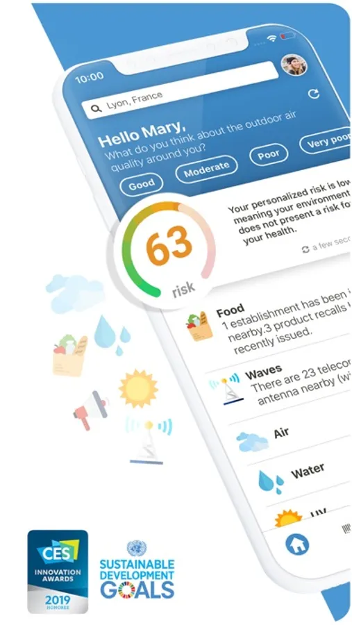 Map in real time the risks related to your environment, such as water pollution, allergens, pesticides, waves, harmful noise, endocrine disruptors as well as the health risks of your food products or in restaurants…